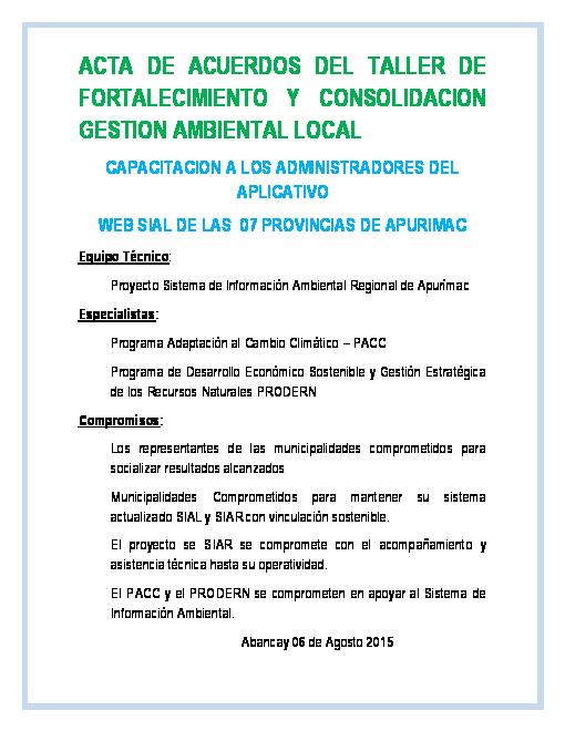 En la ciudad de Abancay, siendo las ocho de la mañana del día cinco de4 agosto del año dos mil quince, con la presencia de representantes de las municipalidades Provinciales y Gerencias Sub Regionales de la Región Apurímac, el equipo técnico del Proyecto Sistema de Información Ambiental de la Regional –SIAR Apurímac y los Especialistas del Programad de Adaptación al Cambio Climático –PACC y Programa de Desarrollo Económico Sostenible Estratégica de los Recursos Naturales - PRODERN