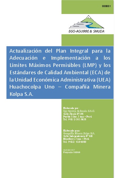 Actualización del Plan Integral para la adecuación e Implementación a los Límites Máximos Permisibles (LMP) y los Estándares de Calidad Ambiental (ECA) de la Unidad Económica Administrativa (UEA) Huachocolpa Uno - Compañía Minera Kolpa S.A. (1 de 2)