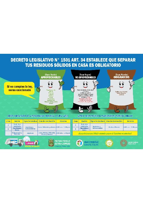 Afiche sobre el decreto legislativo N° 1501 Art. 34 Establece que separar tus residuos solidos en casa es obligatorio