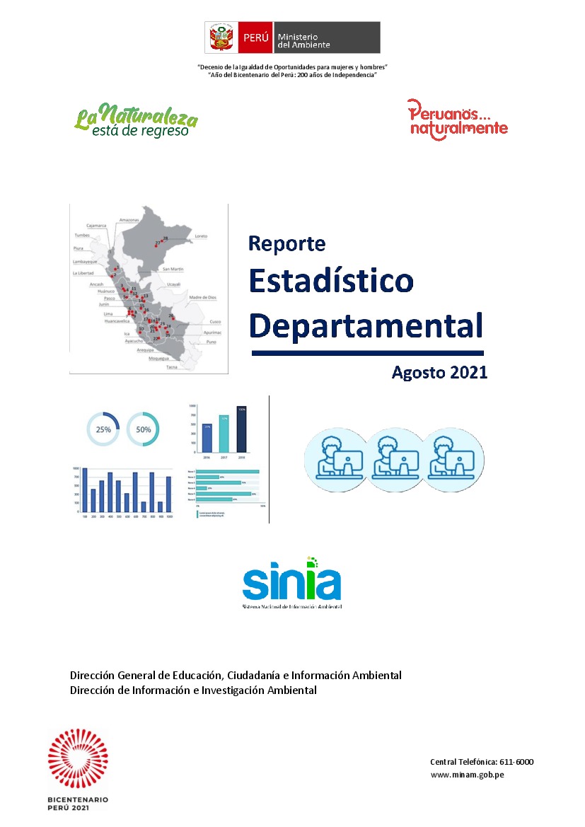 Los reportes estadísticos ambientales departamentales (Dossiers) son documentos de síntesis que contienen datos generales, así como la información estadística más importante sobre la presencia del sector ambiente en los departamentos del Perú, con la finalidad de servir como una herramienta que brinda información de calidad, oportuna y clara sobre el estado del ambiente y los recursos naturales con la finalidad que puedan ser utilizados en los procesos de gestión ambiental y alertar sobre posibles problemas ambientales.