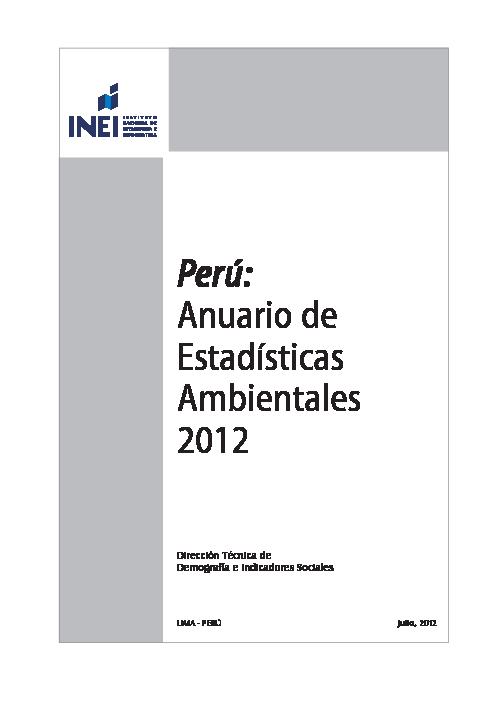 Instituto Nacional de Estadística e Informática (INEI) en cumplimiento de uno de sus objetivos de proporcionar información estadística confiable y oportuna, pone a disposición del público usuario el "Anuario de Estadísticas Ambientales, 2012", documento elaborado sobre la base de la información estadística ambiental generada por las Instituciones Públicas dedicadas a su estudio.