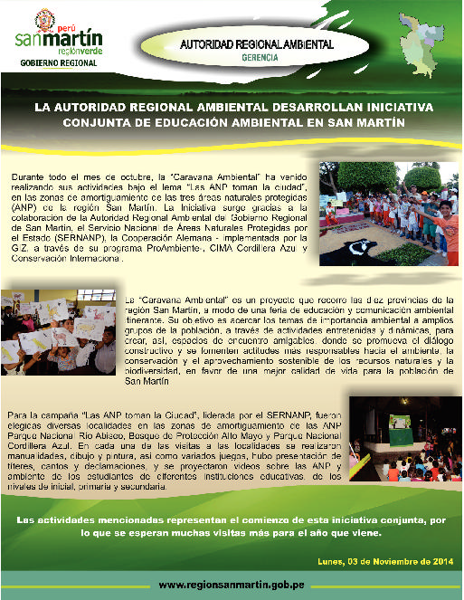 Durante todo el mes de octubre, la Caravana Ambiental ha venido realizando sus actividades bajo el lema \"Las ANP toman la Ciudad\" en las zonas de amortiguamiento de las tres áreas naturales protegidas de la Region San Martin. La iniciativa surge gracias a la colaboración de la Autoridad Regional Ambiental del Gobierno Regional de San Martin, el Servicio Nacional de Areas Protegidas por el Estado - SERNAP, la cooperación Alemana, implementada por la GIZ, a traves de su Programa ProAmbiente, CIMA Cordillera Azul y Conservación Internacional.