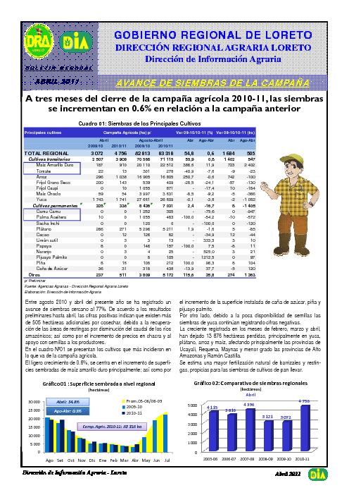 Entre agosto 2010 y abril del presente año se ha registrado un avance de siembras cercano al 77%. De acuerdo a los resultados preliminares hasta abril, las cifras positivas indican que existen más de 505 hectáreas adicionales por cosechar, debido a la recuperación de las áreas de restingas por disminución del caudal de los ríos amazónicos; así como por el incremento de precios en chacra y al apoyo con semillas a los productores.