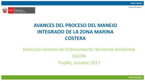 Esta presentación se lleva a cabo en el taller Manejo Integrado de Zonas Marino Costeras (MIZMC) La Libertad, el 20 de Octubre del 2017, por el Ing. Oscar Lazo de la Dirección General de Ordenamiento Territorial Ambiental del Ministerio del Ambiente. El evento se desarrolló en el Auditorio de la sede central del Gobierno Regional La Libertad.