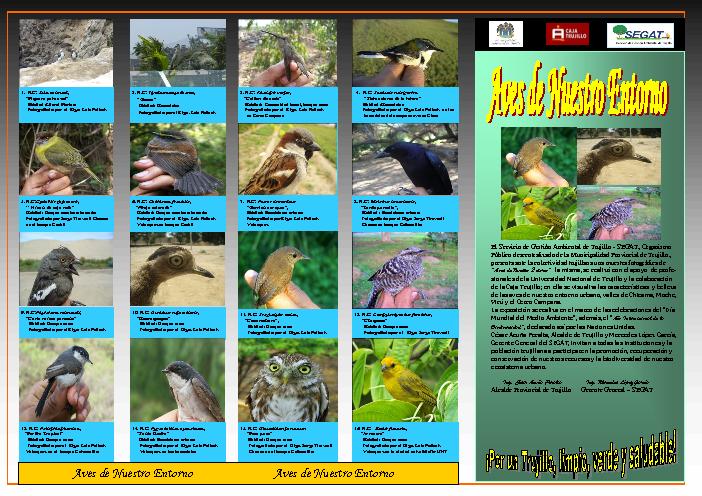 En este folleto incluye las fotografías de la Aves de nuestro entorno urbano, de los valles de Chicama, Moche, Virú y el Cerro Campana que fueron exhibidas todo el mes de junio en la Plaza de Armas de nuestra ciudad; cuyo material fue proporcionado por profesionales de Ciencias Biológicas de la Universidad Nacional de Trujillo, y puesta en vitrina gracias a la colaboración de la Caja Trujillo.