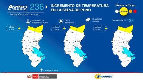 Aviso Meteorológico N°236 "Incremento de temperatura en la selva de Puno"