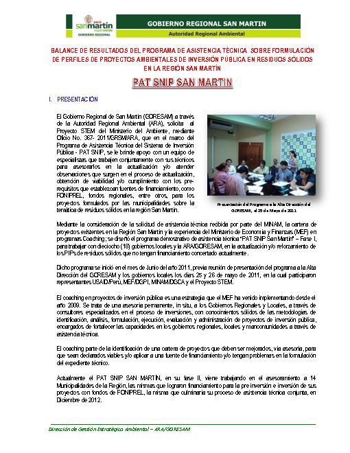Balance de Resultados del Programa de Asistencia Técnica sobre Formulación de Perfiles de Proyectos Ambientales de Inversión Pública en Residuos Sólidos en la Región San Martín – PAT SAN MARTIN.