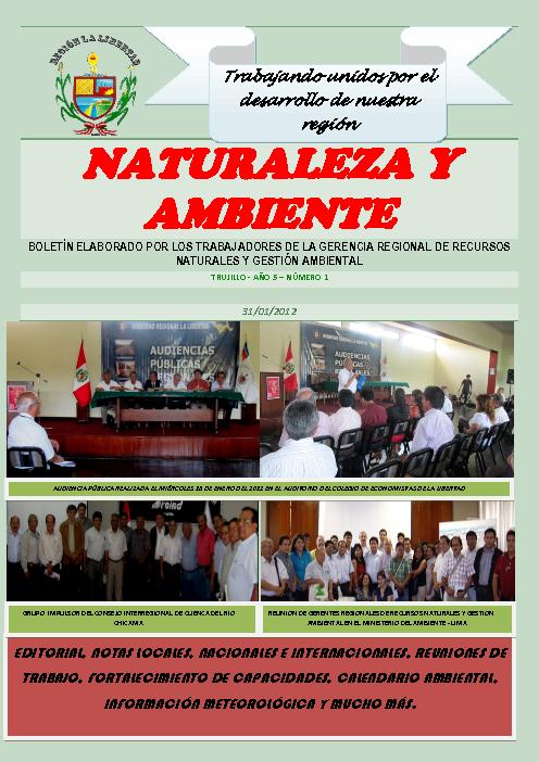La Gerencia Regional del Ambiente presenta su boletín virtual dando ha conocer sus actividades durante el mes de enero tales como: Notas locales, nacionales e internacionales, reuniones de trabajo, fortalecimiento de capacidaes, calendario ambiental, información metereológica y mucho más.