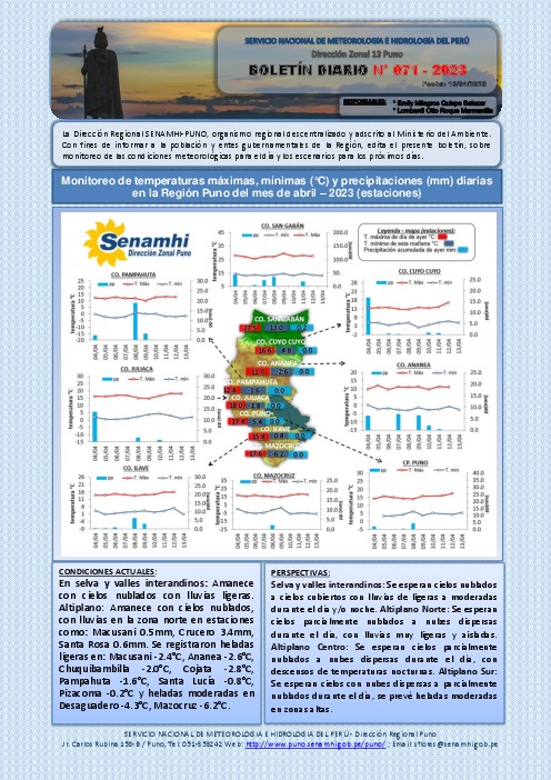 BOLETIN HIDROMETEOROLOGICO DIARIO DE LA REGION DE PUNO, PARA EL 13 DE ABRIL DEL 2023.