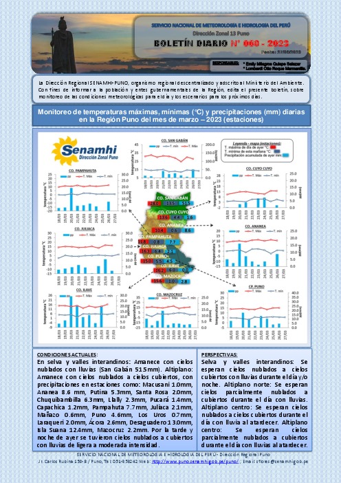 BOLETIN HIDROMETEOROLOGICO DE LA REGION DE PUNO DIARIO PARA EL 27 DE MARZO DEL 2023