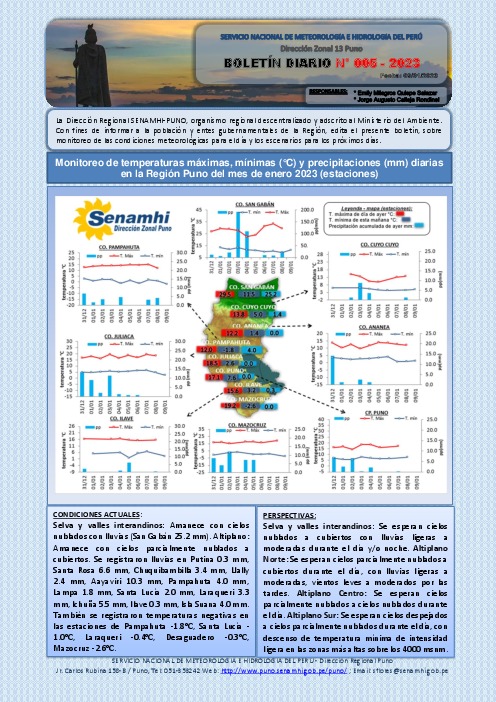La Dirección Regional SENAMHI-PUNO, organismo regional descentralizado y adscrito al Ministerio del Ambiente. Con fines de informar a la población y entes gubernamentales de la Región, edita el presente boletín, sobre monitoreo de las condiciones meteorológicas para el día y los escenarios para los próximos días.