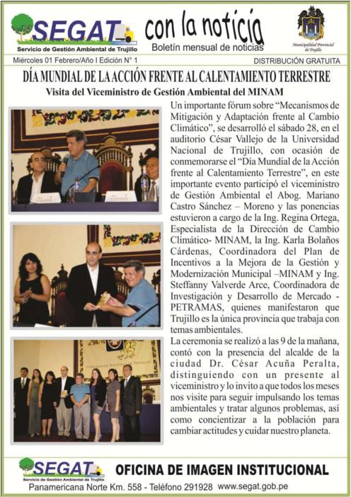 Boletín mensual de noticias del Servicio de Gestión Ambiental de Trujillo donde informa las principales actividades realizadas en el mes de enero como: las actividades desarrolladas por el día mundial de la acción frente al calentamiento terrestre, limpieza de las paredes de la Huaca Takaynamo en La Esperanza, campaña de mercado saludable en los mercados: Mayorista y Central, limpieza de postes, operativos para disminuir la contaminación visual y del aire.