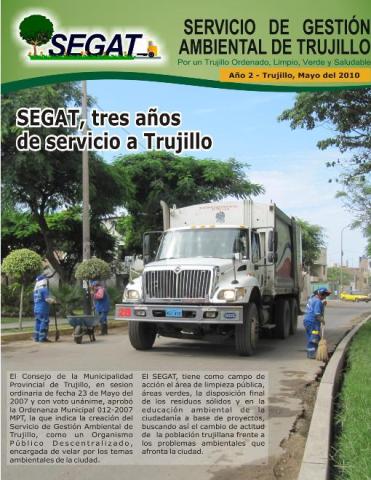 Boletín informativo del Servicio de Gestión Ambiental de Trujillo donde informa las principales actividades realizadas en el mes de mayo como: Tercer aniversario del SEGAT, Erradicación del quinto punto crítico, Campaña a Limpiar Trujillo, SEGAT-UCV y PNUMA desarrollaron taller sobre cambio climático, II Fotomaratón Ambiental y limpieza en el Mercado Mayorista.