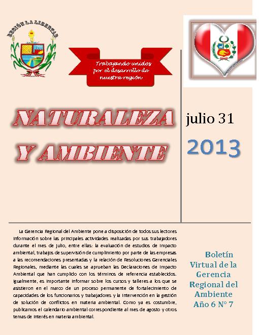 La Gerencia Regional del Ambiente pone a disposición de todos sus lectores información sobre las principales actividades realizadas por sus trabajadores durante el mes de julio, entre ellas: la evaluación de estudios de impacto ambiental, trabajos de supervisión de cumplimiento por parte de las empresas a las recomendaciones presentadas y la relación de Resoluciones Gerenciales Regionales, mediante las cuales se aprueban las Declaraciones de Impacto Ambiental que han cumplido con los términos de referencia establecidos. Igualmente, es importante informar sobre los cursos y talleres a los que se asistieron en el marco de un proceso permanente de fortalecimiento de capacidades de los funcionarios y trabajadores y la intervención en la gestión de solución de conflictos en materia ambiental. Como ya es costumbre, publicamos el calendario ambiental correspondiente al mes de agosto y otros temas de interés en materia ambiental.