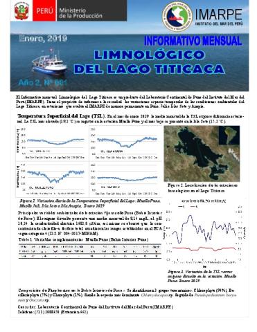 Tiene el propósito de informar a la sociedad las variaciones de espacio temporales de las condiciones ambientales del Lago Titicaca, en estaciones que evaluar el IMARPE de manera permanente en Puno, Juli y Anapia - Información mensual ENERO - 2019.