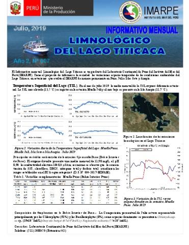 Tiene el propósito de informar a la sociedad las variaciones de espacio temporales de las condiciones ambientales del Lago Titicaca, en estaciones que evaluar el IMARPE de manera permanente en Puno, Juli y Anapia - Información mensual JULIO - 2019.