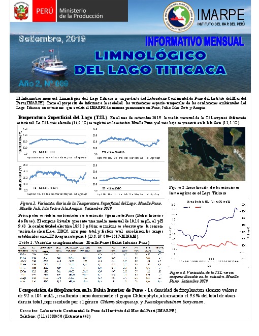 Tiene el propósito de informar a la sociedad las variaciones de espacio temporales de las condiciones ambientales del Lago Titicaca, en estaciones que evaluar el IMARPE de manera permanente en Puno, Juli y Anapia - Información mensual SEPTIEMBRE - 2019.