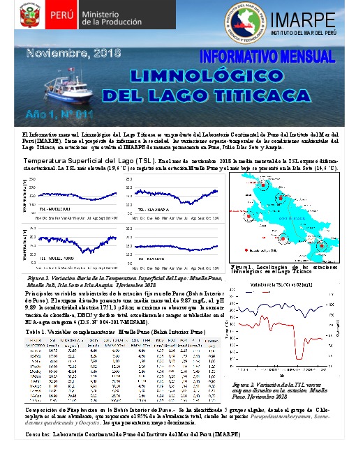 Tiene el propósito de informar a la sociedad las variaciones de espacio temporales de las condiciones ambientales del Lago Titicaca, en estaciones que evaluar el IMARPE de manera permanente en Puno, Juli y Anapia - NOVIEMBRE - 2018 ,