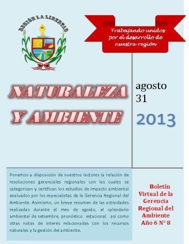 Ponemos a disposición de nuestros lectores la relación de resoluciones gerenciales regionales con las cuales se categorizan y certifican los estudios de impacto ambiental evaluados por los especialistas de la Gerencia Regional del Ambiente. Asimismo, un breve resumen de las actividades realizadas durante el mes de agosto, el calendario ambiental de setiembre, pronóstico estacional, así como otras notas de interés relacionadas con los recursos naturales y la gestión del ambiente
