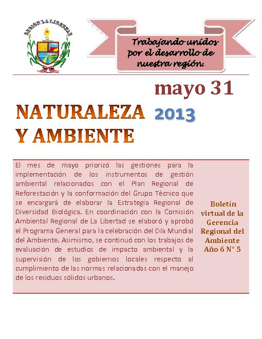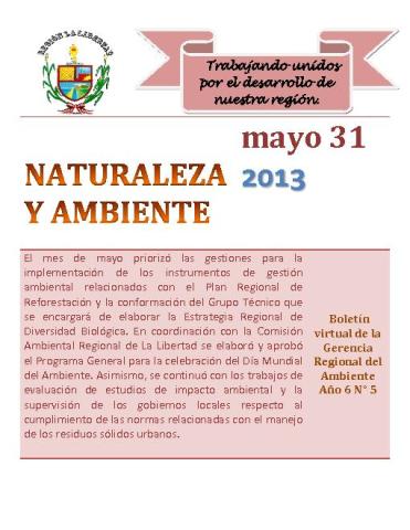 La Gerencia Regional del Ambiente presenta su boletìn virtual, dando a conocer las diversas actividades realizadas durante el mes de Mayo del 2013.