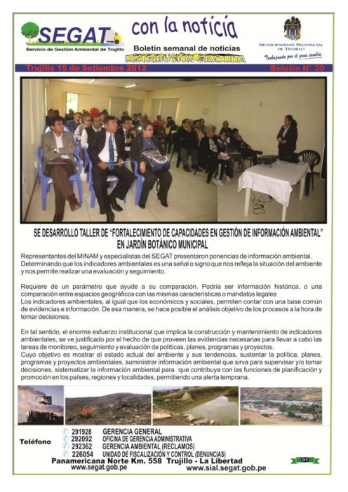 En este boletín se informa las actividades realizadas por el SEGAT en la segunda semana de setiembre, como desarrollo del taller de "Fortalecimiento de capacidades en Gestión de Información Ambiental", mantenimiento de las áreas verdes en la Zona 05 de Trujillo, Ministerio Público en coordinación con el SEGAT realizaron diligencia en fábrica de embutidos en La Esperanza, Venta pública directa de residuos sólidos del Programa de Segregación.