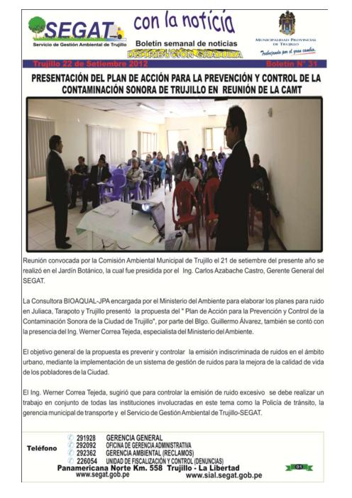 En este boletín se informa las actividades realizadas por el SEGAT en la tercera semana de setiembre, como la presentación del plan de acción para la prevención y control de la contaminación sonora de Trujillo en reunión de la CAMT y capacitación a alumnos de diferentes universidades de Trujillo que participarán en las mediciones de ruido en la ciudad.