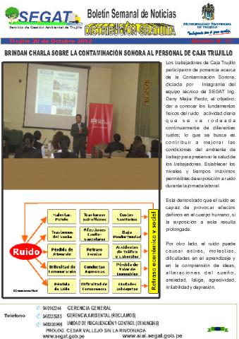 En este boletín se informa las actividades realizadas por el SEGAT de la primera y segunda semana de octubre, como charla sobre la contaminación sonora al personal de Caja Trujillo, personal administrativo y operativo del SEGAT sensibiliza a taxistas y peatones y instalación de paneles educativos en diferentes puntos de la ciudad.