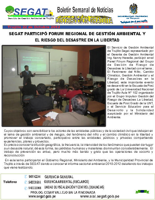 En este boletín se informa las actividades realizadas por el SEGAT en la tercera semana de octubre, como la participación en el Forum Regional de Gestión Ambiental y el riesgo del desastre en La Libertad, campaña de limpieza "Municipalidad en tu Barrio" en la urb. Mochica y San Fernando y Campaña "Mes del no ruido".
