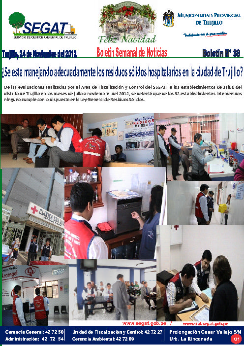 En este boletín se informa las actividades realizadas por el SEGAT del 19 al 24 de noviembre, como campaña de limpieza en el mercado La Hermelinda, Inspección en el museo de sitio del Complejo Arqueológico de Chan Chan y reunión de la CAMT donde se trató la problematica de los residuos sólidos hospitalarios de la provincia de Trujillo.
