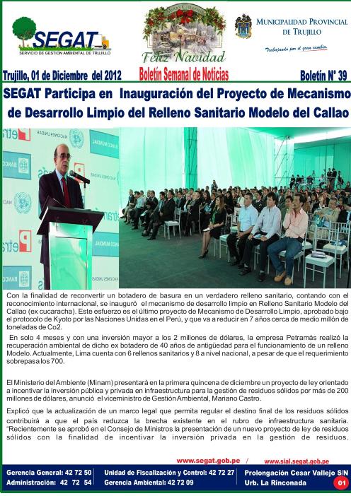 En este boletín se informa las actividades realizadas por el SEGAT del 26 al 30 de noviembre, como la participación en la inauguración del proyecto de mecanismo de desarrollo limpio del relleno sanitario del Callao, jornadas de limpieza públicas en los puntos críticos de la ciudad y operativos en conjunto con la Fiscalía para decomisar briquetas de carbón con el fin de evitar su comercialización por los efectos colaterales que causa a la salud de las personas que la utilizan.