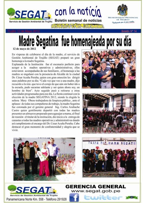 En este boletín se informa las actividades realizadas por el SEGAT en la segunda semana de Mayo como la celebración a la madre Segatina, limpieza en centro cívico y en el parque del Niño Urb. Las Quintanas.