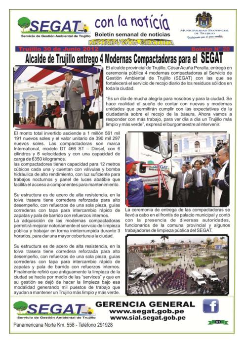 En este boletín se informa las actividades realizadas por el SEGAT en la cuarta semana de junio como la entrega de 4 modernas compactadoras, participación como jurado en la Feria de Ciencias en la I.E. N° 80031 del distrito de Florencia de Mora, Convenio SEGAT y Caja Trujillo, reunión del Grupo Técnico de la provincia de Ascope con especialistas de la institución y capacitación a conductores.