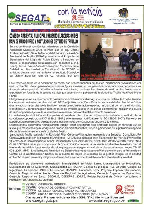 En este boletín se informa las actividades realizadas por el SEGAT en la primera semana de julio como la reunión de la Comisión Ambiental de la Provincia de Trujillo, I Taller “Fortalecimiento de Capacidades de Gestión Ambiental Urbano", mantenimiento de áreas verdes en hospital Regional, supervisión a establecimientos de salud y capacitación a integrantes de Seguridad y Turismo de la municipalidad provincial.