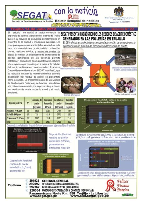 En este boletín se informa las actividades realizadas por el SEGAT en la segunda semana de julio como la presentación del diagnóstico de los residuos de aceite doméstico generados en las pollerías en Trujillo, infracción a 6 establecimientos de atención de salud, realización del estudio de caracterización de los residuos sólidos urbanos en Trujillo, mantenimiento de las áreas verdes de las principales avenidas y campaña para minimizar los niveles de ruido en Trujillo.