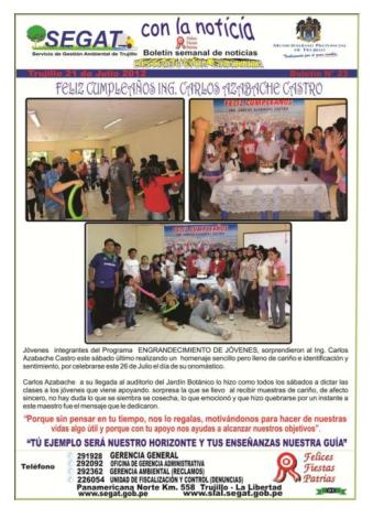 En este boletín se informa las actividades realizadas por el SEGAT en la tercera semana de julio como la entrega de 3 cisternas para el riego de las áreas verdes, capacitación de fortalecimiento en la aplicación correcta de las infracciones, capacitación a empresarios del sector hotelero y restaurante, limpieza en el centro cívico, campaña de sensibilización sobre conservación del medio ambiente en la Facultad de Educación de la Universidad Nacional de Trujillo, limpieza en complejo arqueológico Chan Chan, donación de plantas ornamentales al Jardín Botánico y saludo.