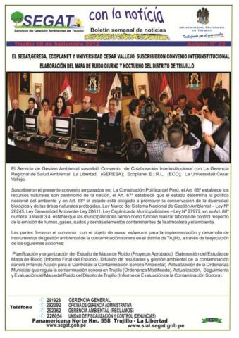 En este boletín se informa las actividades realizadas por el SEGAT en la primera semana de setiembre, como la suscripción del convenio interinstitucional del SEGAT, ECOPLANET, y la universidad Cesár Vallejo para elaboración del mapa de ruido diurno y nocturno de Trujillo, abogados del SEGAT son capacitados y donación de tachos a instituciones educativas.