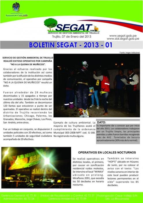 En este boletín se informa las actividades realizadas por el SEGAT en la primera semana de enero como operativo por campaña no a la quema de muñecos, operativos en locales nocturnos como MINKA y HOPS inspección a las fábricas clandestinas de carbón.