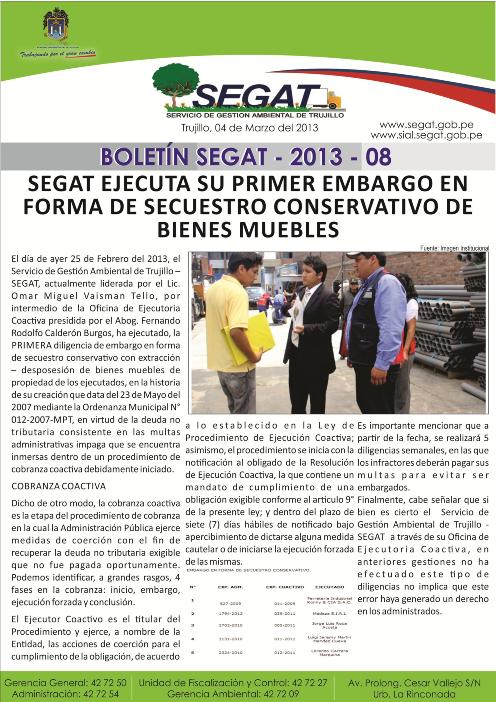 En este boletín se informa las actividades realizadas por el SEGAT en la cuarta semana de febrero como: Ejecución del primer embargo en forma de secuestro conservativo de bienes inmuebles, inauguración de nuevo parque en la Urb. Natacha Alta, SEGAT y la WWF unirán esfuerzos para la Hora del Planeta en Trujillo.