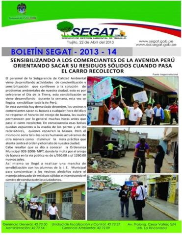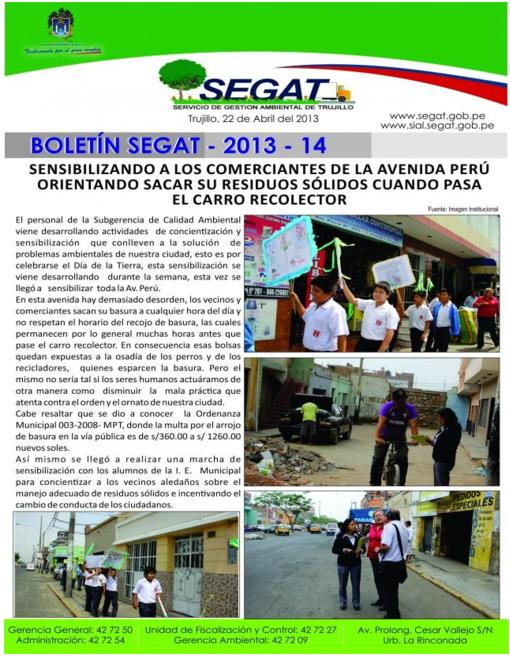 En este boletín se informa sobre las actividades realizadas por el Servicio de Gestión Ambiental de Trujillo en la tercera semana de Abril como: Sensibilización a los comerciante de las avenidas Perú y Vallejo con la finalidad que saquen sus residuos cuando pasa el carro recolector y conformación del comité de evaluación del PIGARS para evaluar a los distritos de Trujillo.