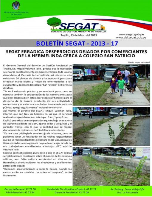 En este boletín se informa sobre las actividades realizadas por el Servicio de Gestión Ambiental de Trujillo en la segunda semana de Mayo como: Erradicación de desperdicios dejados por comerciantes de La Hermelinda cerca a colegio San Patricio, SEGAT recibe de Municipalidad más de medio millón por cumplir metas del Plan de Incentivos a la mejora de la Gestión y Modernización Municipal y campaña de limpieza en pistas, veredas y sardineles por estragos de la lluvia en la ciudad de Trujillo.