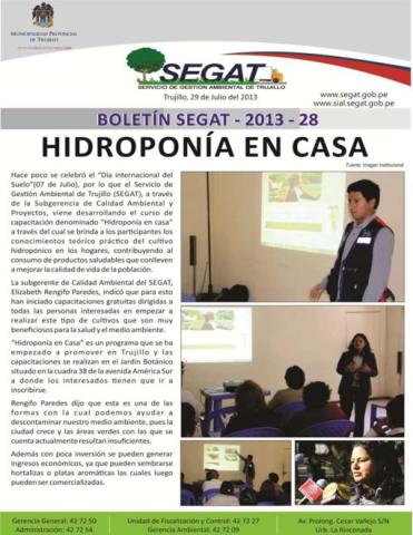 En este boletín se informa sobre las actividades realizadas por el Servicio de Gestión Ambiental de Trujillo en la última semana de Julio como: capacitación en hidroponía, limpieza integral en Av. Mansiche y sus alrededores y formalización de tricicleros.