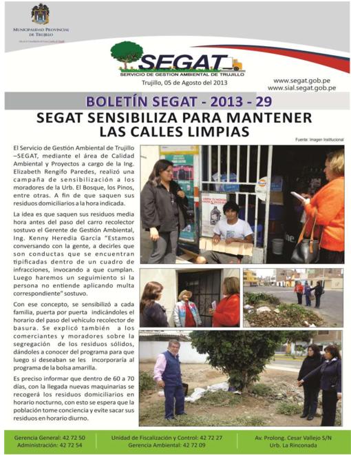 En este boletín se informa sobre las actividades realizadas por el Servicio de Gestión Ambiental de Trujillo en la primera semana de Agosto como: Sensibilización para mantener las calles limpias, erradicación de basura y desmonte en Av. Prolong. Antenor Orrego.