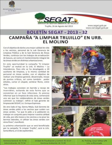 En este boletín se informa sobre las actividades realizadas por el Servicio de Gestión Ambiental de Trujillo del 19 de Agosto al 25 de Agosto como: Campaña "A Limpiar Trujillo" en Urb. El Molino, embargó por incumplimiento de pago de multa por contaminación sonora y capacitación a fiscalizadores.