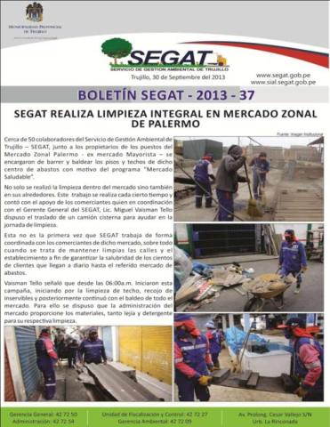 En este boletín se informa sobre las actividades realizadas por el Servicio de Gestión Ambiental de Trujillo del 23 de Setiembre al 29 de Setiembre como: Campaña de limpieza integral en Mercado Zonal de Palermo, resembrado de gras en prolongación Sánchez Carrión, campaña de monitoreo de emisiones vehiculares en Av. España y Taller de difusión del reglamento de residuos de aparatos eléctricos y electrónicos (RAEE).