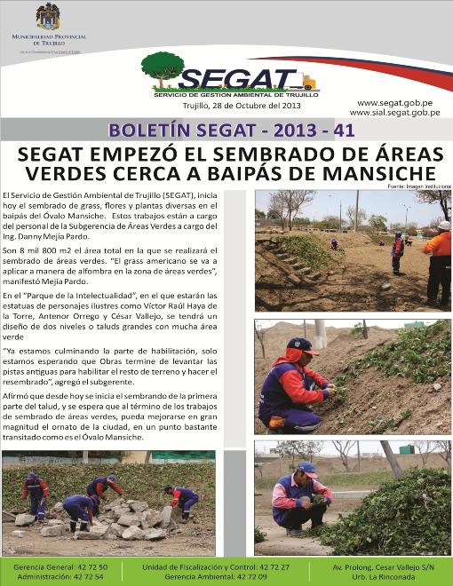 En este boletín se informa sobre las actividades realizadas por el Servicio de Gestión Ambiental de Trujillo del 21 de Octubre al 27 de Octubre como: Sembrado de áreas verdes cerca a baipás de Mansiche, reunión técnica de los representantes de los SIAR-SIAL en Lima, lanzamiento de la campaña "TECNORECICLA RAEE TRUJILLO" y jornada de limpieza y baldeado en parque de Urb. Daniel Hoyle.
