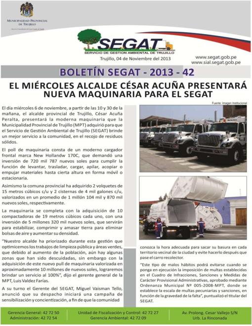 En este boletín se informa sobre las actividades realizadas por el Servicio de Gestión Ambiental de Trujillo del 28 de Octubre al 03 de Noviembre como: Presentación de nueva maquinaria para el SEGAT, taller de bonsai en Jardín Botánico y Taller informativo para la prevención de conflictos socio ambientales conla participación de la OEFA .