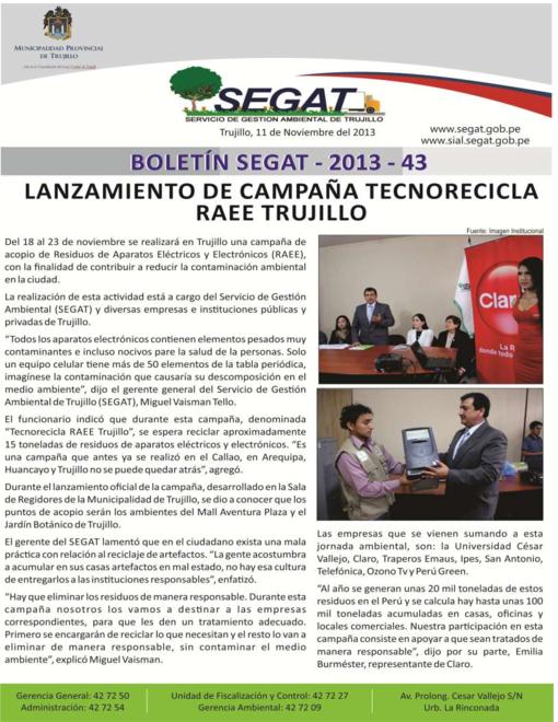 En este boletín se informa sobre las actividades realizadas por el Servicio de Gestión Ambiental de Trujillo del 04 al 10 de Noviembre como: Lanzamiento de Campaña Tecnorecicla RAEE Trujillo, capacitación a fiscalizadores con respecto la modificación e incorporación de Ordenanza Municipalidad 003-2008-MPT y cambio de horario de recolección de basura a partir del 07 de noviembre.