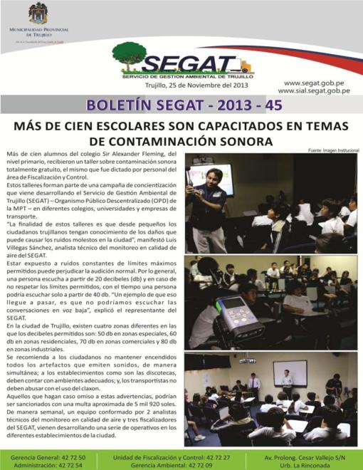 En este boletín se informa sobre las actividades realizadas por el Servicio de Gestión Ambiental de Trujillo del 18 al 24 de Noviembre como: Más de cien escolares son capacitados en temas de contaminación sonora, se preparan nuevos horarios y rutas para recojo de la basura, finalizan sembrado en {áreas verdes de bypass Mansiche y semana de acopio de Residuos de Aparatos Eléctricos y Electrónicos (RAEE).