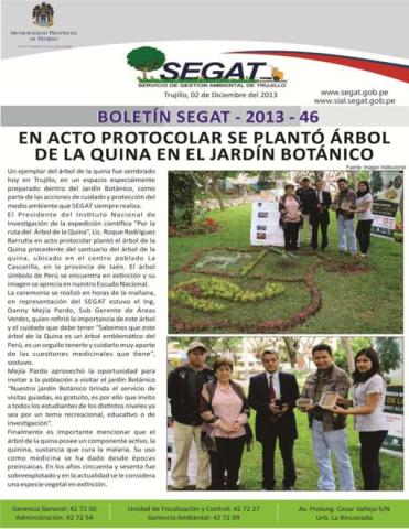 En este boletín se informa sobre las actividades realizadas por el Servicio de Gestión Ambiental de Trujillo del 25 de Noviembre al 01 de Diciembre como: En acto protocolar se plantó Árbol de la Quinua en el Jardín Botánico, implementación de áreas verdes en Trujillo, estudiantes de maestría son capacitados en temas de contaminación ambiental y vecinos irresponsables son multados por sacar sus residuos a destiempo.