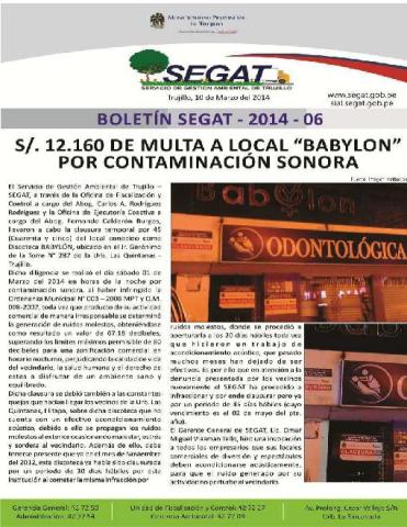 En este boletín se informa sobre las actividades realizadas por el Servicio de Gestión Ambiental de Trujillo en la última semana de febrero y primera semana de marzo del 2014 como: Multa a local "BABYLON" por contaminación sonora, Conferencia: Impacto del Mercurio sobre la salud humana y el ambiente en La Libertad, entrega de certificados del Taller Mini Jardín y Terrarios y participación en la Conmemoración del 479 Aniversario de la Fundación de Trujillo.